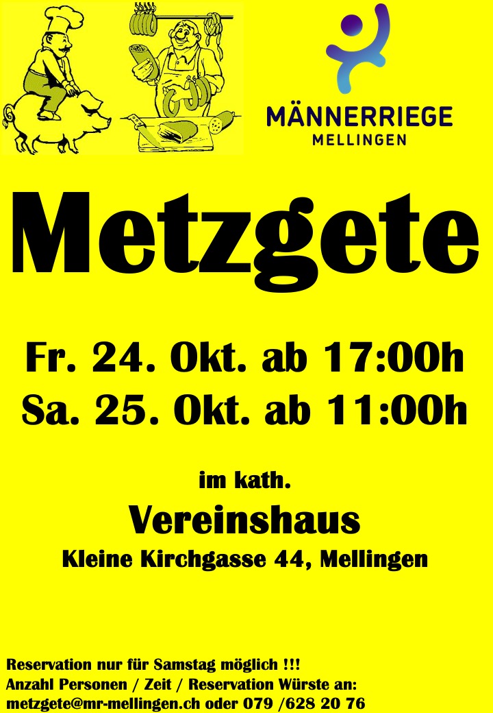 Wir Männerriegler von Mellingen führen dieses Jahr wieder unsere tradionelle Metzgete am Freitag, 24. Oktober ab 17.00 Uhr und am Samstag, 25. Oktober ab 10.00 Uhr im Vereinshaus an der Kleinen Kirchgasse 44, Mellingen durch.
